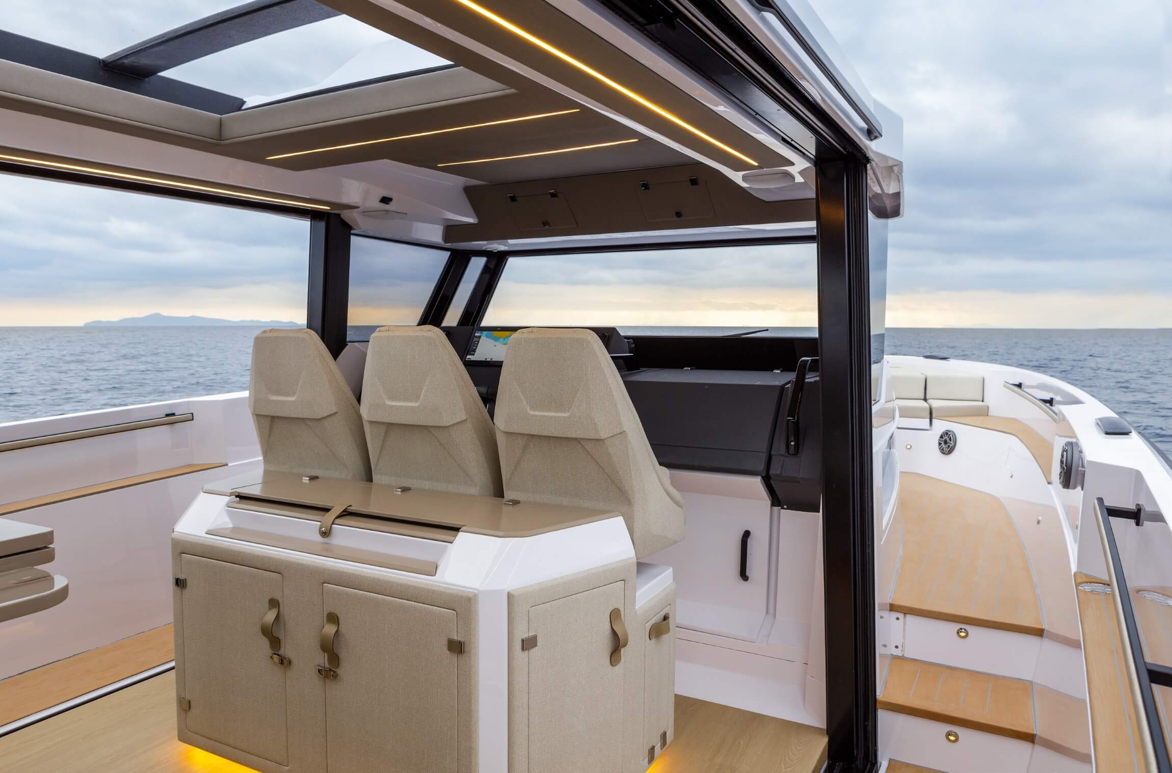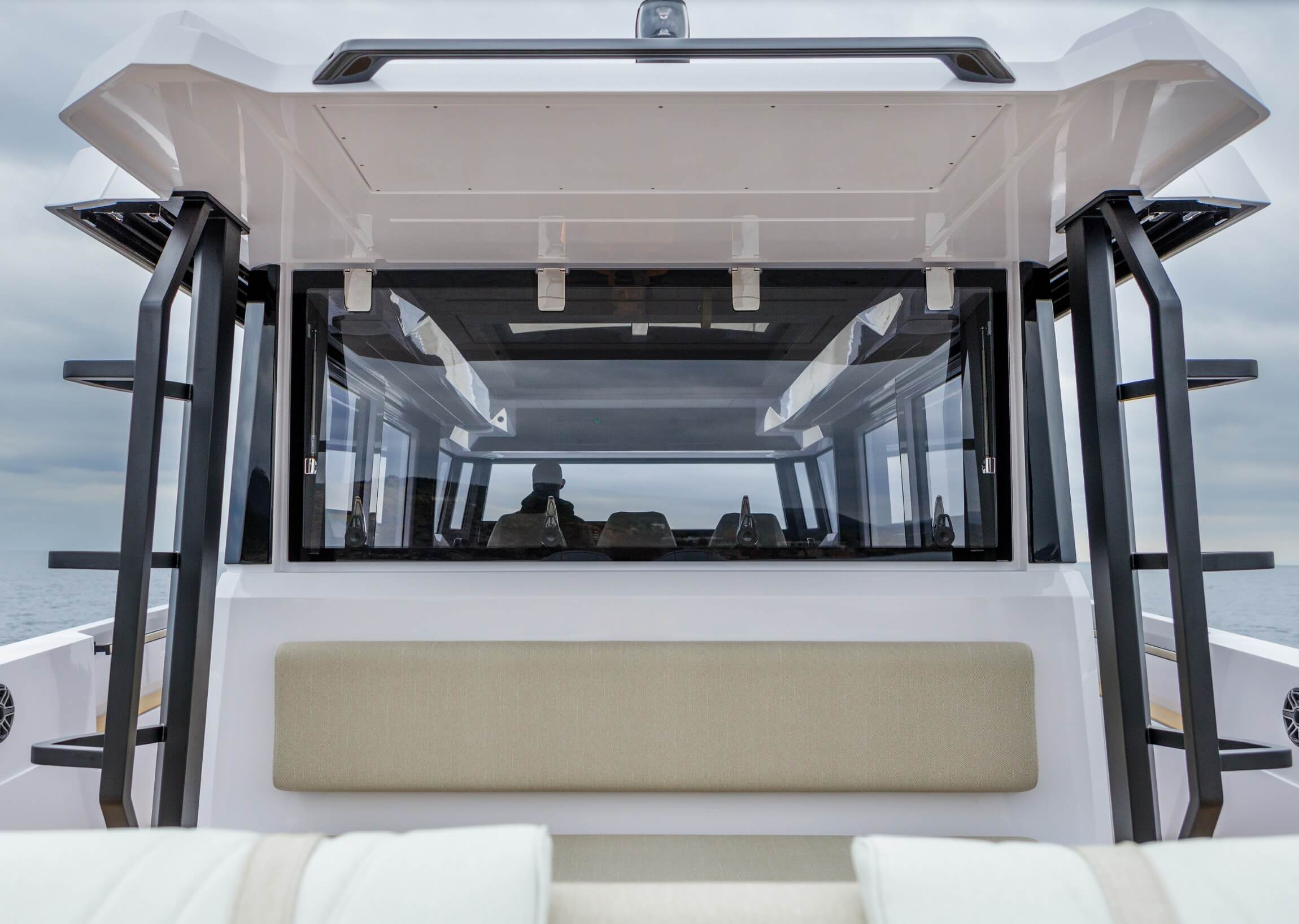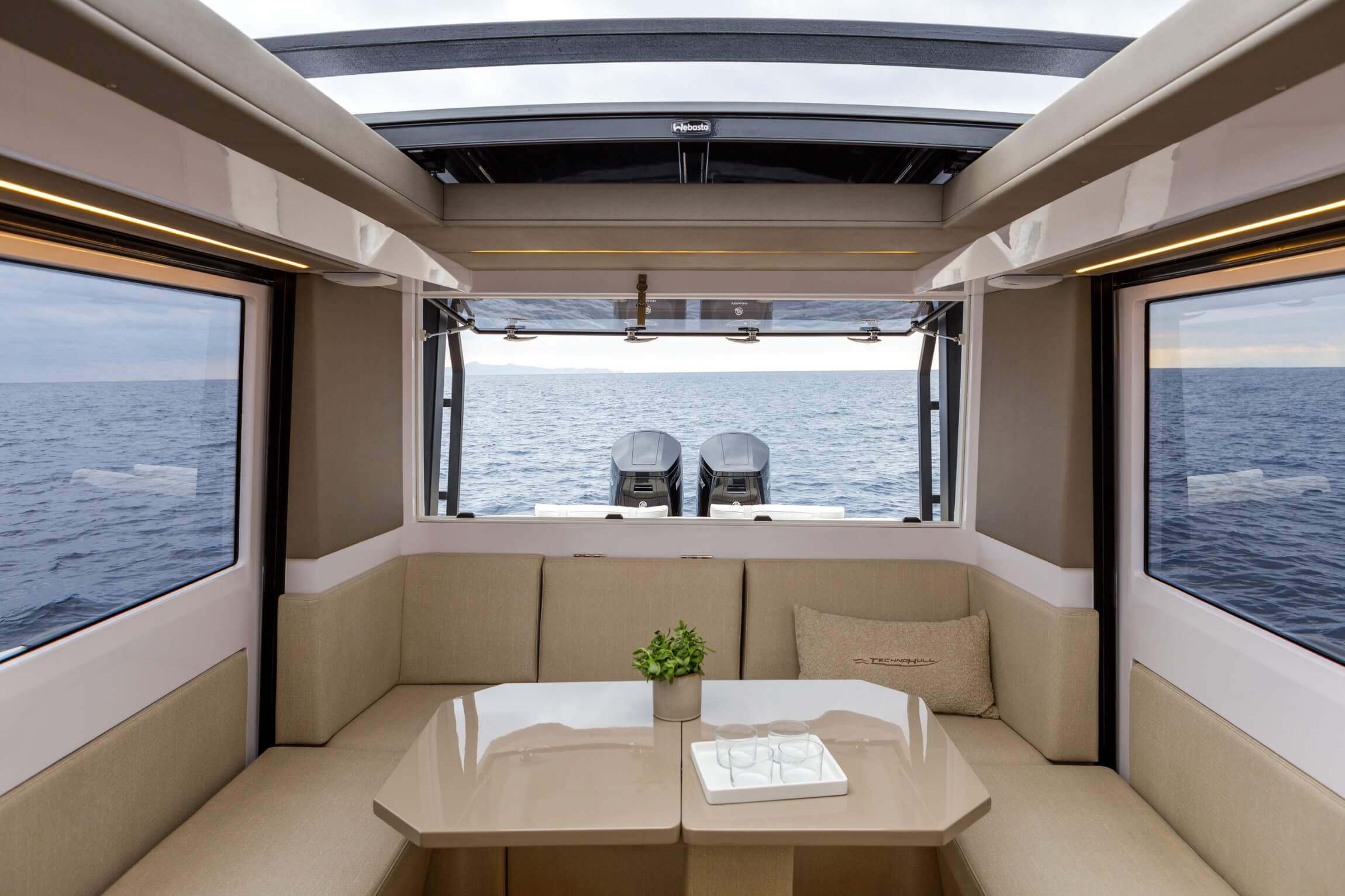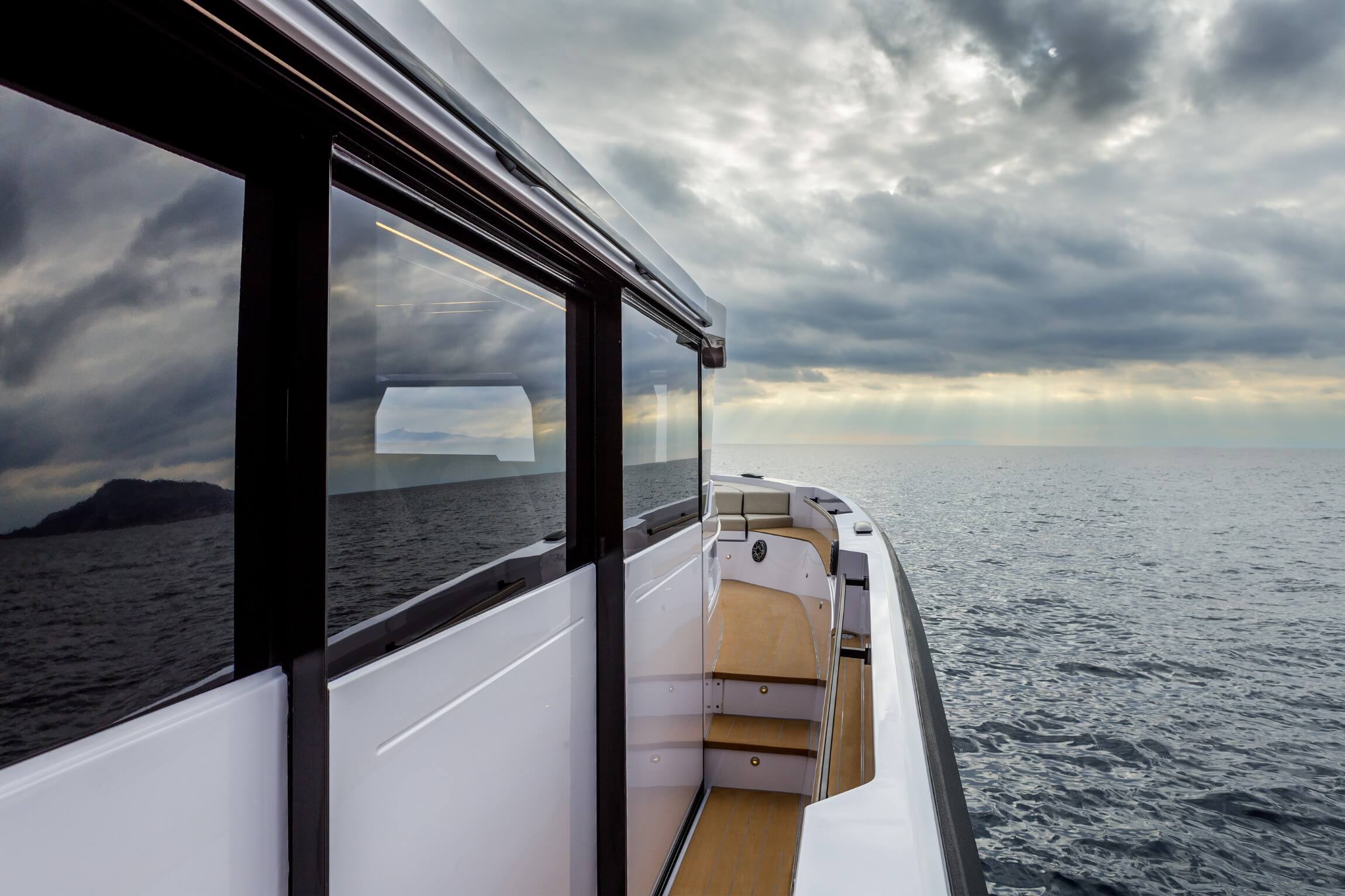 A shelter in rough seas and an open deck under clear skies, the fully protected convertible superstructure delivers a limitless experience and unlocks the freedom of year-round cruising. Featuring retractable sliding doors, a sliding sunroof, and a fully-opening aft window, it transforms at a push of a button from a completely enclosed, weather-protected space into an open-air lounge, allowing the guest to enjoy top-tier comfort at his own terms.