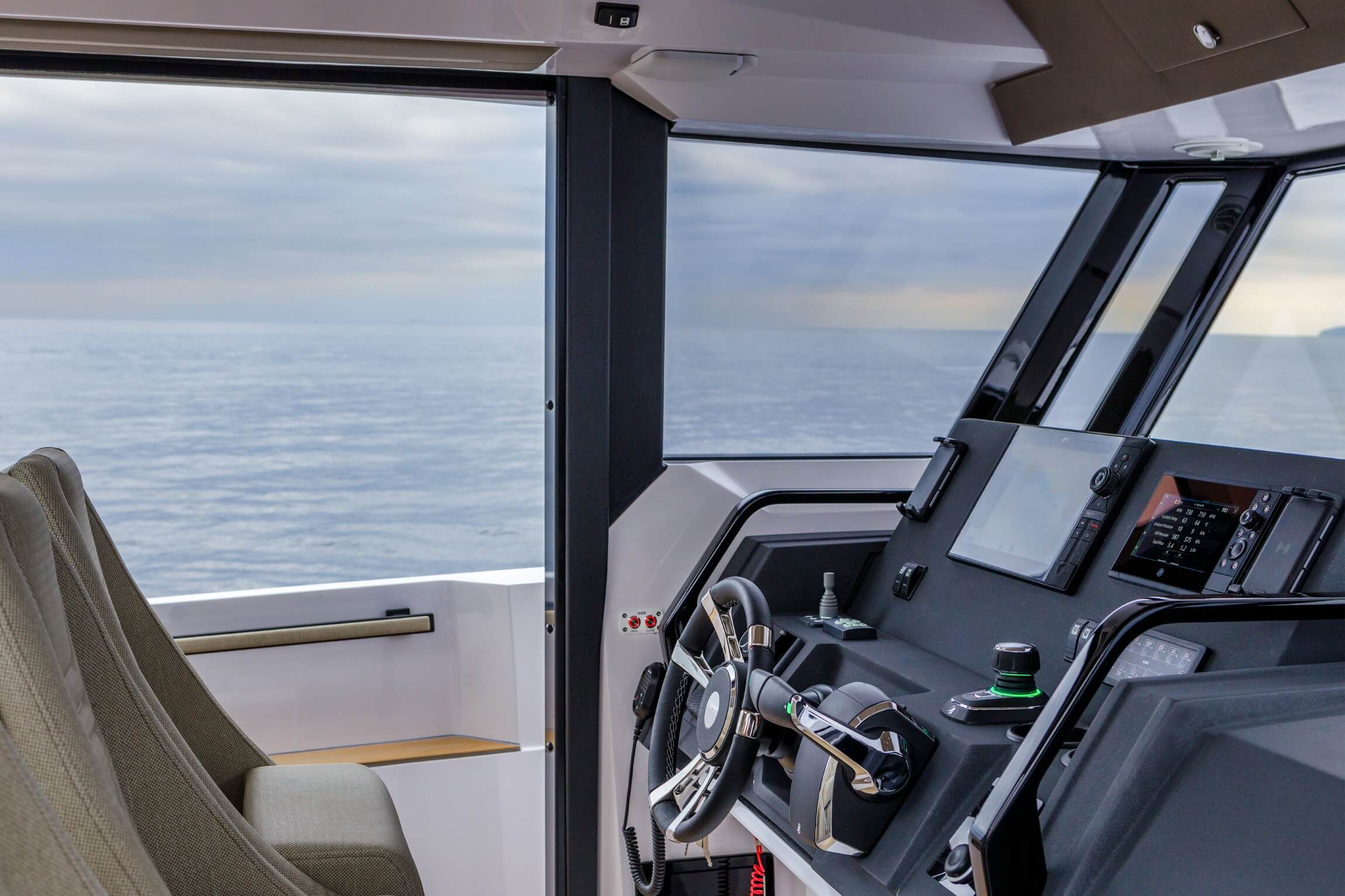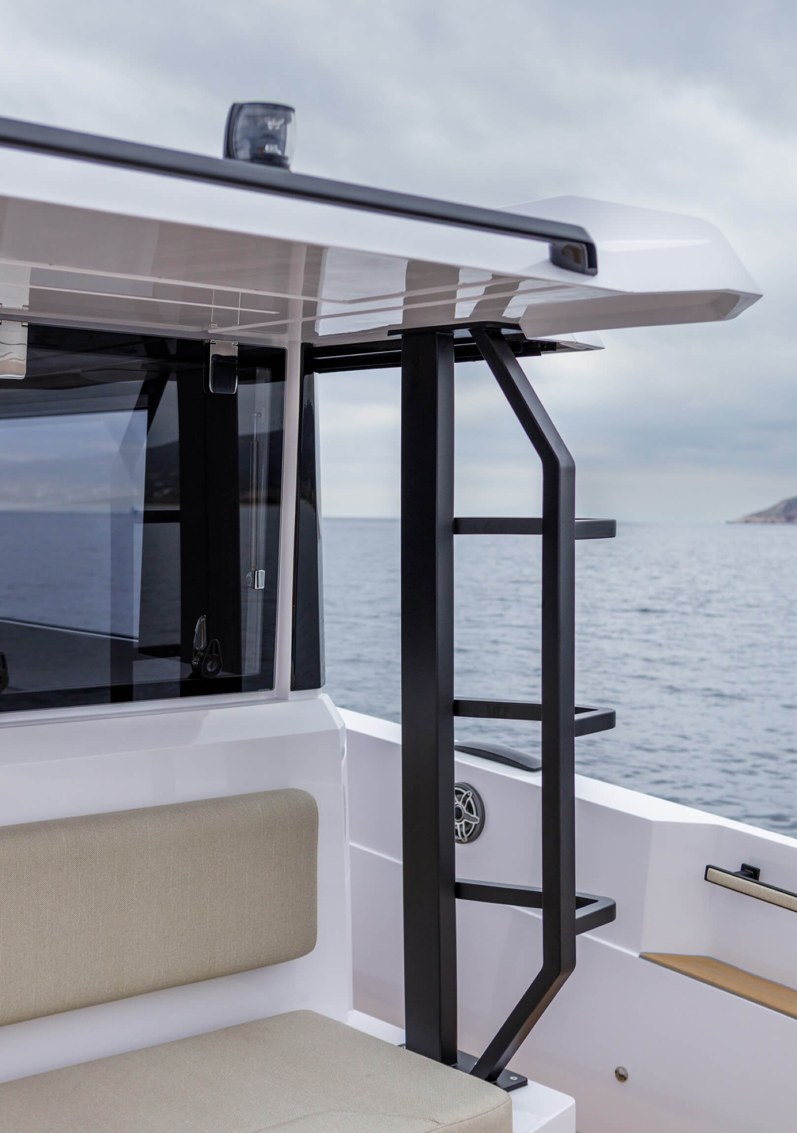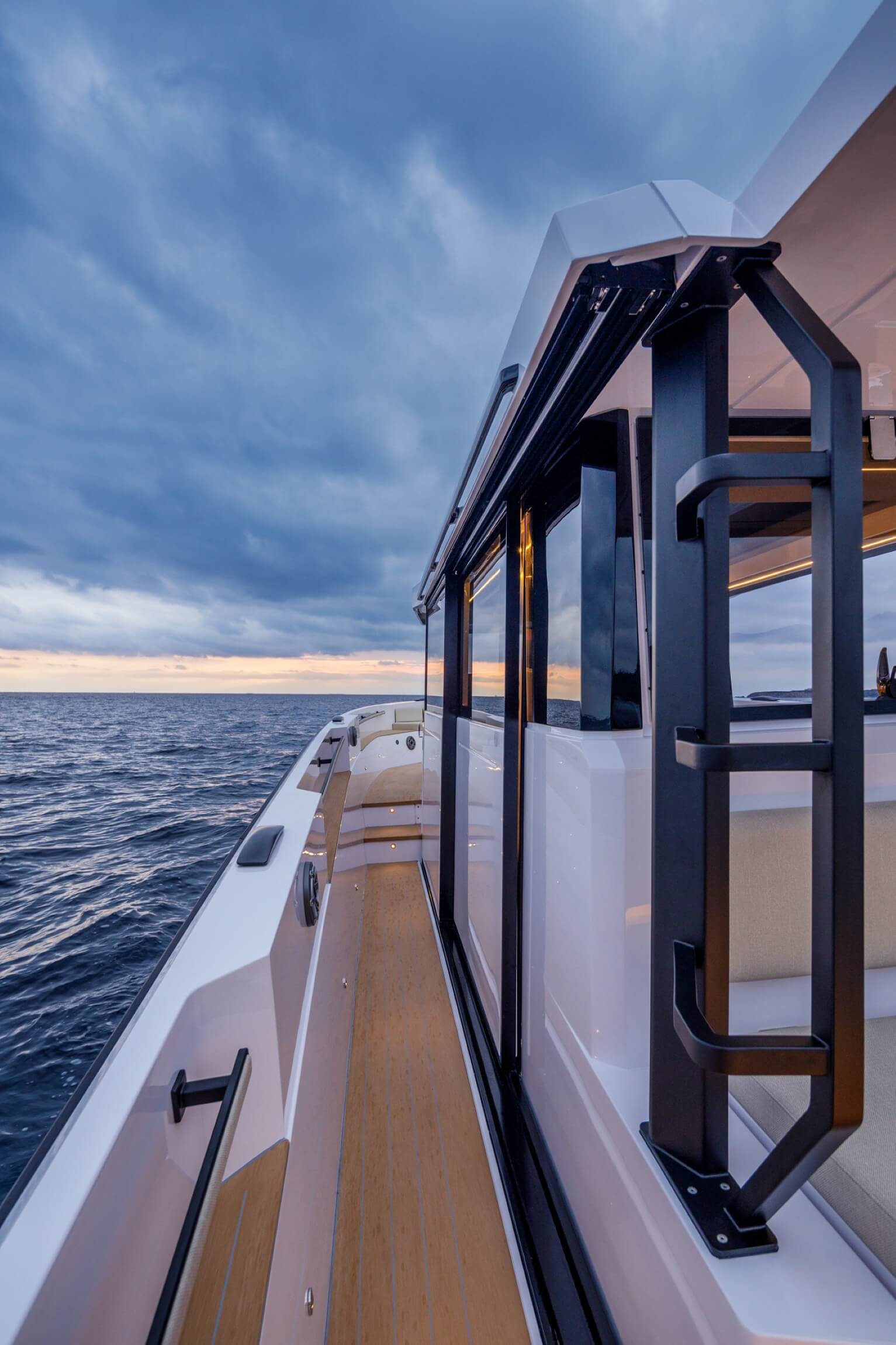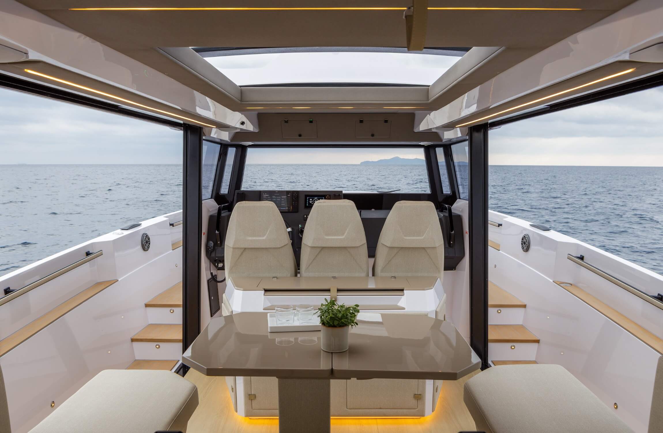 A shelter in rough seas and an open deck under clear skies, the fully protected convertible superstructure delivers a limitless experience and unlocks the freedom of year-round cruising. Featuring retractable sliding doors, a sliding sunroof, and a fully-opening aft window, it transforms at a push of a button from a completely enclosed, weather-protected space into an open-air lounge, allowing the guest to enjoy top-tier comfort at his own terms.